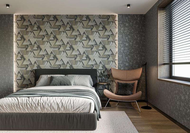 Геометрический мотив вместе с компаньоном удобно клеить в любом направлении – это облегчает поклейку, а дизайнерское комбинирование позволяет оклеить все помещение сразу в едином стиле.